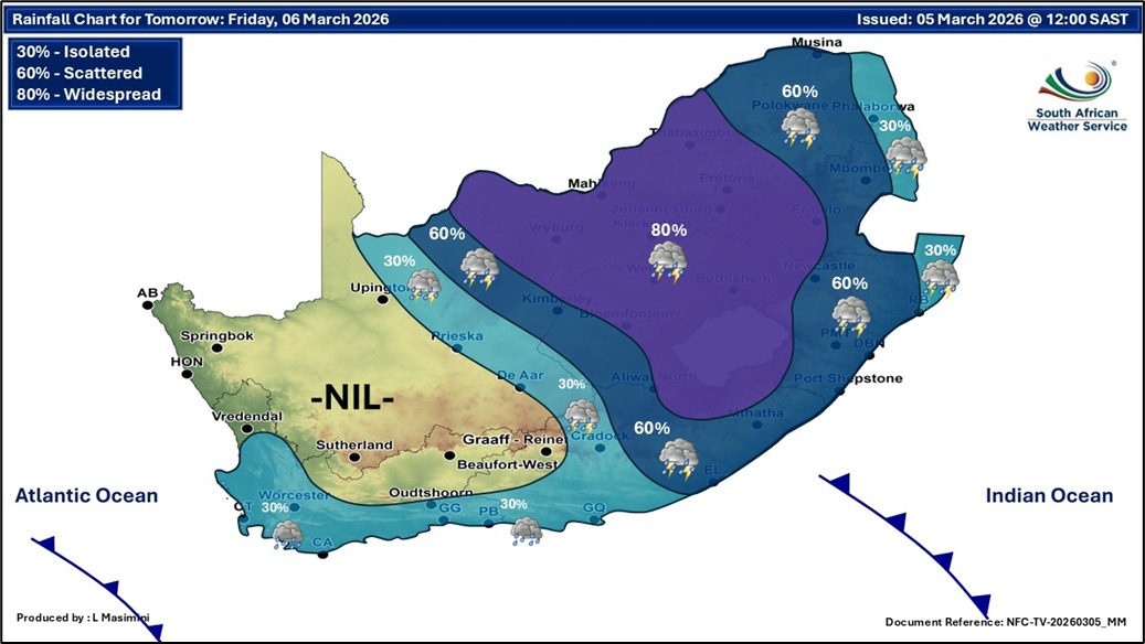 ‘n Weervoorspeller, Tokelo Chiloane, sê storms kan tot skadelike winde, weerlig, hael en plaaslike oorstromings lei.