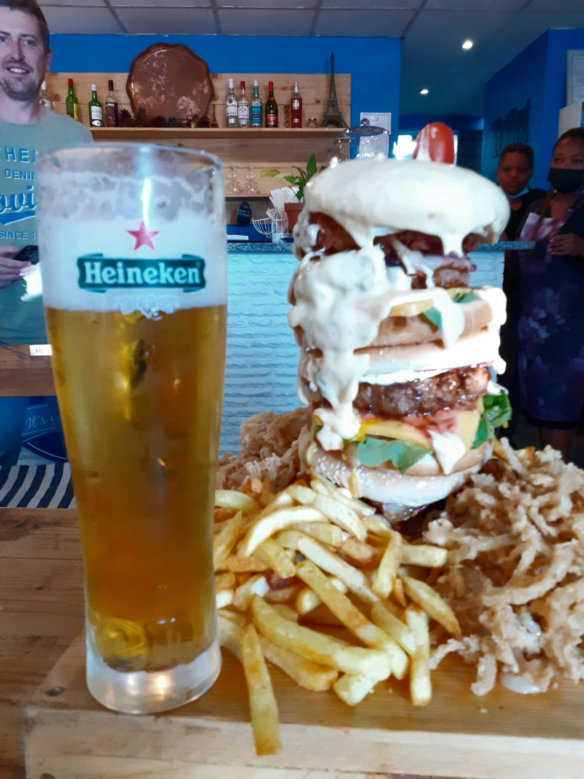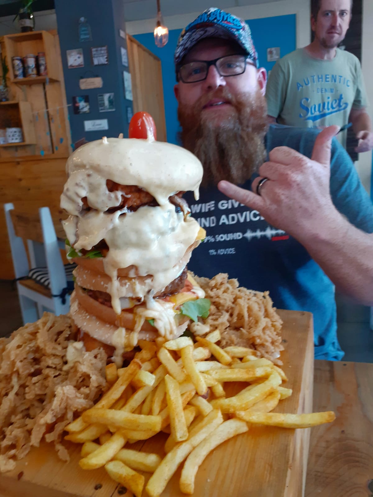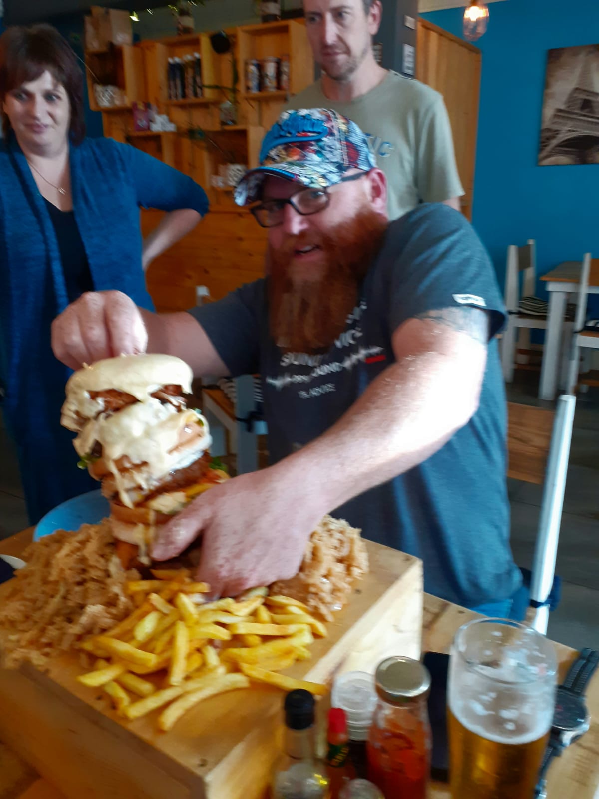 Werner Terblanche het vanmiddag eerste aangesit by Que’s Café vir hul burger-uitdaging. Hy was een van die dapper deelnemers wat ‘n trippeldekker burger van 2,5 kg binne 20 minute moes probeer kafdraf. Kon hy daarin slaag?