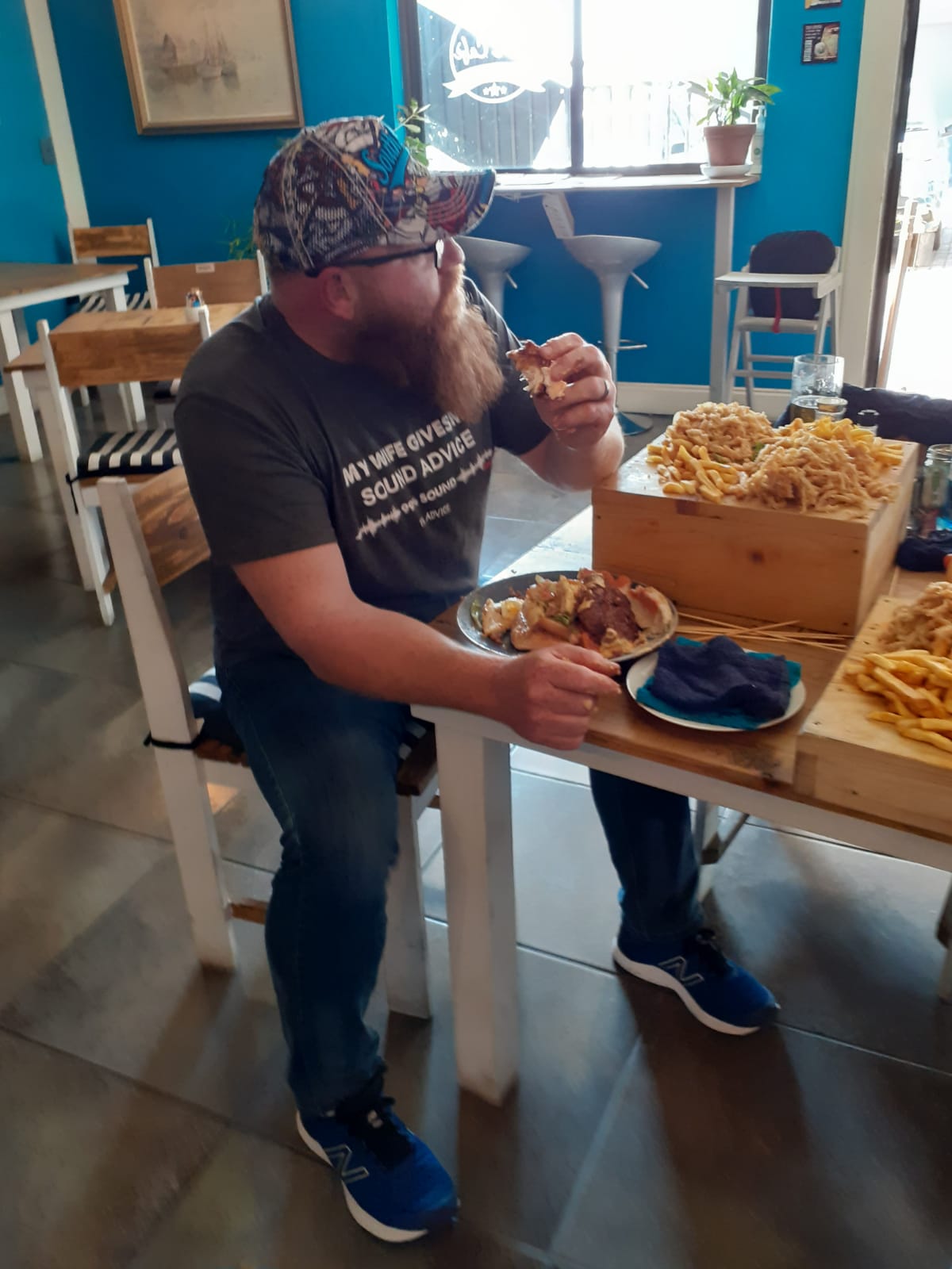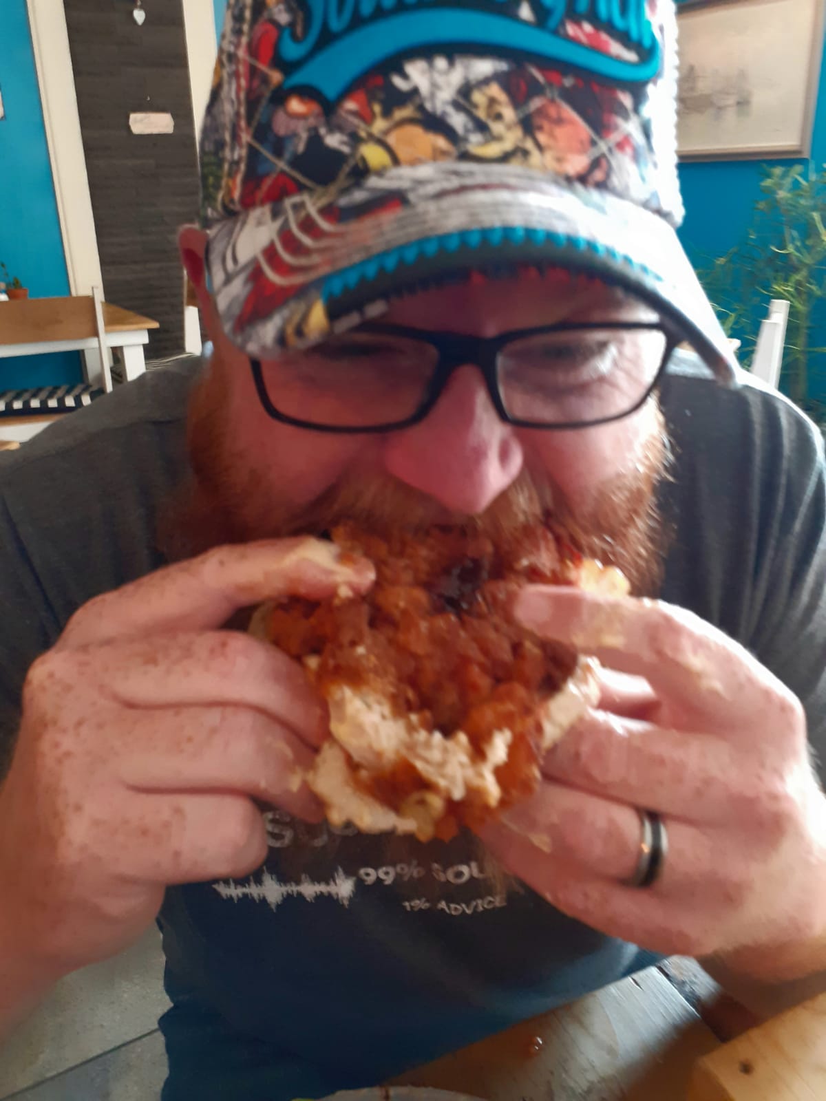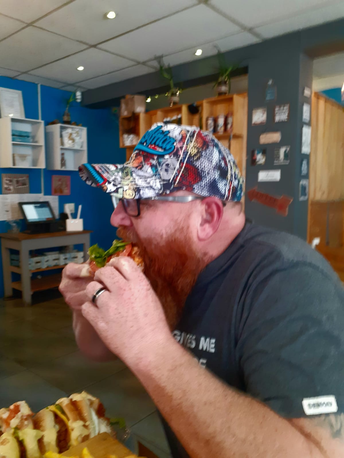Werner Terblanche het vanmiddag eerste aangesit by Que’s Café vir hul burger-uitdaging. Hy was een van die dapper deelnemers wat ‘n trippeldekker burger van 2,5 kg binne 20 minute moes probeer kafdraf. Kon hy daarin slaag?
