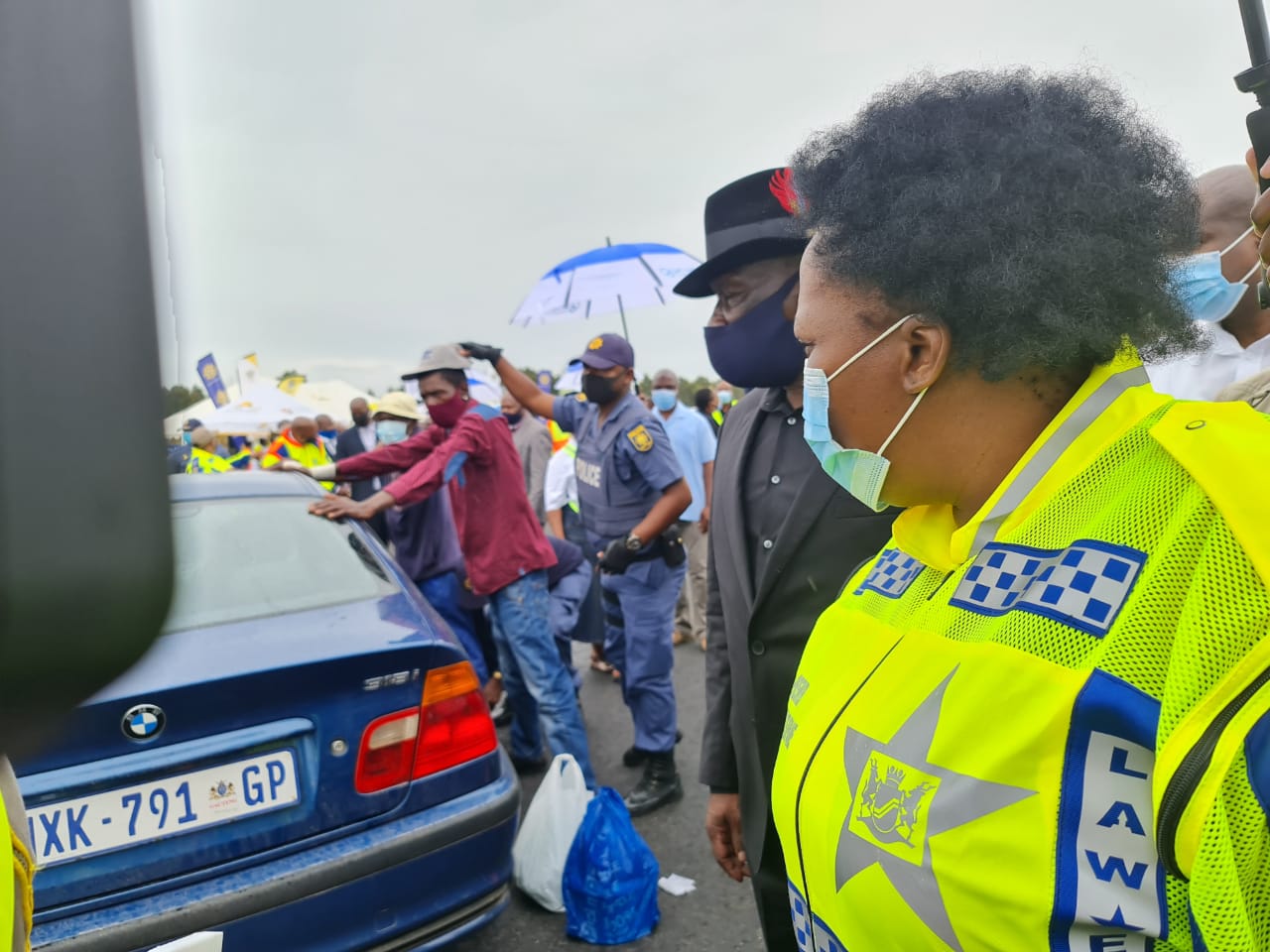 Sy is deur die minister van polisie, gen. Bheki Cele, en die minister van vervoer, Fikile Mbalula, vergesel.